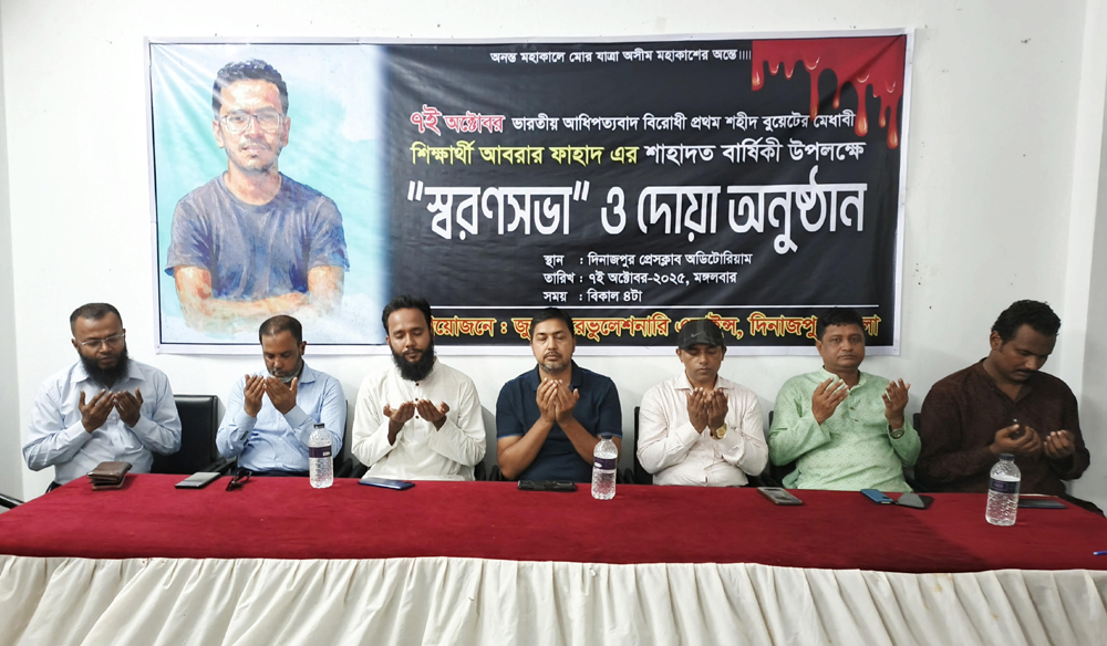 ভারতীয় আধিপত্যবাদ বিরোধী প্রথম শহীদ বুয়েটের মেধাবী শিক্ষার্থী আবরার ফাহাদ-এর ৭ম শাহাদত বার্ষিকী উপলক্ষ্যে জুলাই রেভুলেশনারি এলাইন্স দিনাজপুর জেলা এর আয়োজনে দিনাজপুর প্রেস ক্লাবে আজ মঙ্গলবার বিকেল সাড়ে ৪ টায় স্মরণ সভা ও দোয়া অনুষ্ঠান অনুষ্ঠিত হয়েছে।