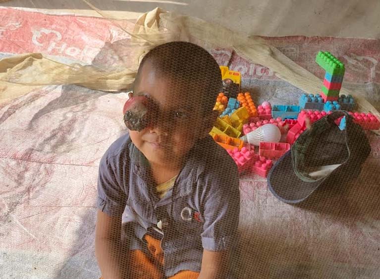 সরকারি প্রাথমিক বিদ্যালয়ের প্রাক-প্রাথমিকের শিক্ষার্থী শিশু রাফির বাড়িতে সরজমিনে গিয়ে দেখা যায়, বাড়ির বারান্দায় একটি মশারির ভেতরে শুয়ে কাতরাচ্ছে সে। বিভৎস চোখটিতে মাছির উপদ্রব থেকে রক্ষার জন্য তাকে মশারির মধ্যে রাখা হয়েছে।