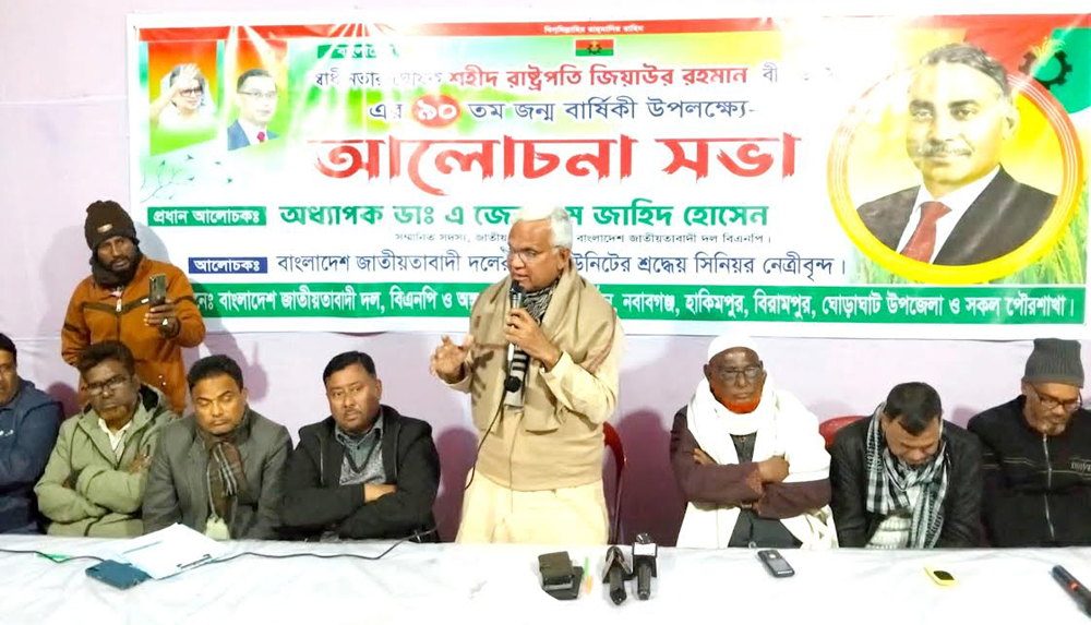 স্বাধীনতার ঘোষক, বহুদলীয় গণতন্ত্রের প্রবর্তক ও বাংলাদেশ জাতীয়তাবাদি দলের প্রতিষ্ঠাতা শহীদ রাষ্ট্রপতি জিয়াউর রহমানের ৯০তম জন্ম বার্ষিকী উপলক্ষে দিনাজপুরের নবাবগঞ্জে দোয়া ও আলোচনা সভায় প্রধান অতিথি হিসেবে এসব কথা বলেন বিএনপির স্থায়ী কমিটির সদস্য ও আসন্ন ত্রয়োদশ জাতীয় সংসদ নির্বাচনে দিনাজপুর-৬ আসনে বিএনপির মনোনীত সংসদ সদস্য প্রার্থী অধ্যাপক ডাঃ এজেডএম জাহিদ হোসেন।