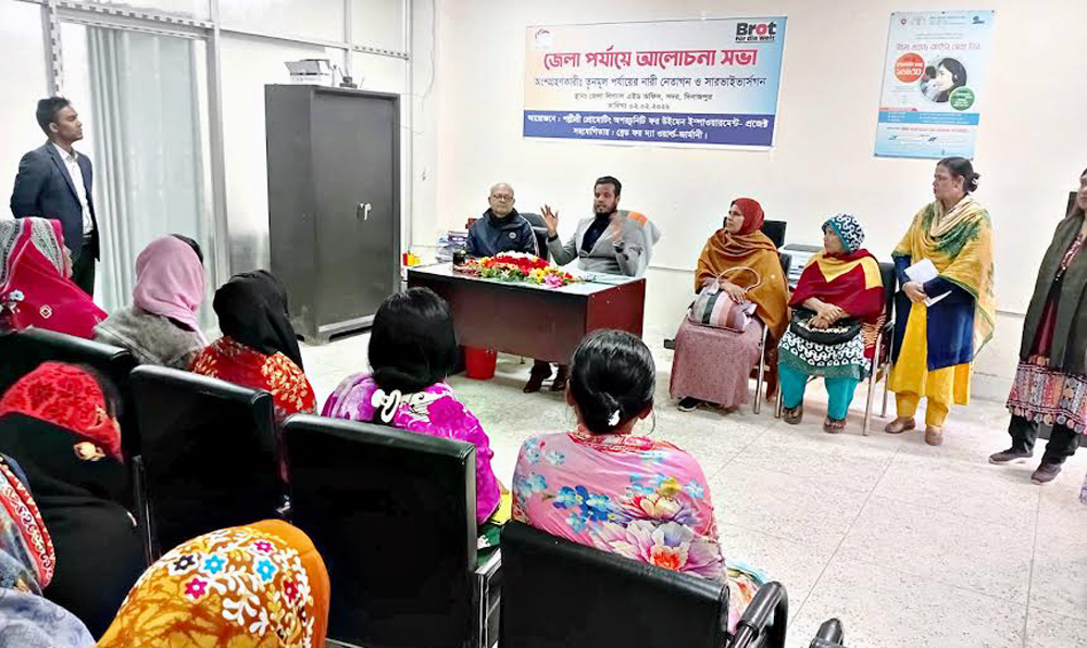 আজ সোমবার জেলা লিগ্যাল এইড অফিস দিনাজপুরের সভা কক্ষে পল্লীশ্রী প্রোমোটিং অপরচুনিটি ফর উইম্যান ইম্পাওয়ারমেন্ট প্রজেক্ট এর আয়োজনে এবং ব্রেড ফর দ্যা ওয়ার্ল্ড-জার্মানীর সহযোগিতায় সিবিও নারী নেতাদের এবং আইনি সহায়তা প্রত্যাশী তৃণ্যমূল বিচার প্রার্থী নারীদের নিয়ে জেলা পর্যার্য়ে আলোচনা সভায় তিনি প্রধান অতিথির বক্তব্যে এ কথা গুলো বলেন। সিবিও নারী নেতা সভা প্রধান রেহেনা বেগমের সভাপতিত্বে স্বাগত বক্তব্য রাখেন পল্লীশ্রীর ম্যানেজার মো. সেলিম রেজা। শুভেচ্ছা বক্তব্য রাখেন পল্লীশ্রী’র প্রোগ্রাম অফিসার শাহাজাদী শিরিন, সভা প্রধান সবুড়া বেগম। উপকারভোগী ও আইনি সহায়তা প্রত্যাশী বিচার প্রার্থী সোনামণি, দিপা মুসলিমা খাতুন ও মোছা. বেবি আক্তার তাদের চলমান ভুক্তভোগী সার্বিক অবস্থায় তুলে ধরে বক্তব্য দিলে তার সমাধানের বিষয় জেলা লিগ্যাল এইড অফিসার সমাধানের পথ বলে দেন সিনিয়র সিভিল জজ ইসরাফিল আলম। সঞ্চালকের দায়িত্ব পালন করেন পল্লীশ্রীর কাউন্সিলার কৃষ্ণা দাস। উক্ত জেলা আলোচনা সভায় তৃণমূল পর্যায়ের নারী নেতাগণ ও সারভাইভার্সগন উপস্থিত ছিলেন।