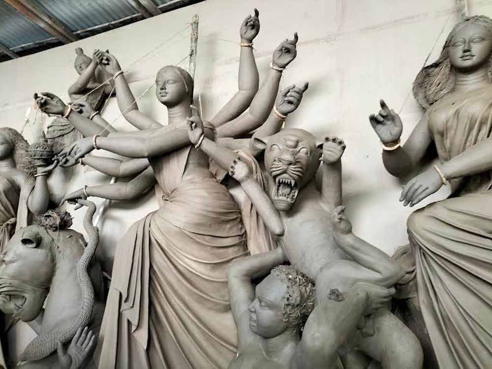 শৈল্পিক নৈপুণ্যে সাজছে দেবী দূর্গা