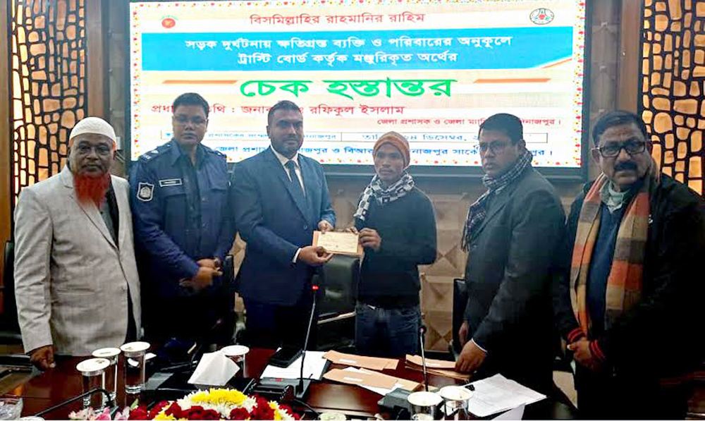 দিনাজপুর জেলা প্রশাসকের সম্মেলন কক্ষে জেলা প্রশাসন ও বিআরটিএ-এর আয়োজানে সড়ক দূর্ঘটনায় ক্ষতিগ্রস্থ ব্যাক্তি ও পরিবারের অনুকূলে ট্রাস্টি বোর্ড কতৃর্ক মঞ্জুরিকৃত ২১ জনের মাঝে ৫৯ লক্ষ টাকার চেক হস্তান্তর করা হয়েছে।