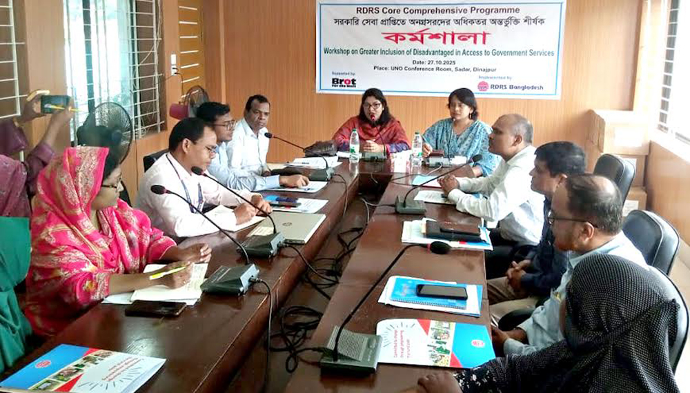 আজ সোমবার দিনাজপুর সদর ইউএনও কনফারেন্স রুমে আরডিআরএস বাংলাদেশের আয়োজনে সরকারি সেবা প্রাপ্তিতে অনগ্রসর অধিকতর অন্তর্ভুক্তি শীর্ষক কর্মশালার উদ্বোধন করতে গিয়ে তিনি প্রধান অতিথির বক্তব্যে এ কথাগুলো বলেন। স্বাগত বক্তব্য রাখেন আরডিআরএস বাংলাদেশ রংপুর হতে আগত টেকনিক্যাল অফিসার জাহিদা মোস্তারি লিসা। কমিউনিটি ডেভেলপমেন্ট সুপারভাইজার সমিত্র কুমার এর সঞ্চালনায় সরকারি সেবা প্রাপ্তির ক্ষেত্রে সুবিধাগুলো তুলে ধরে বক্তব্য রাখেন উপজেলা কৃষি অফিসার মো. আব্দুল্লাহ আল মাসুদ তুষার, উপজেলা সমাজসেবা অফিসার গোলাম আজম, উপজেলা সমবায় অফিসার মো. হাফিজুর ইসলাম, উপজেলা প্রাণিসম্পদ অফিসা মোছা. শাহিনা বেগম, উপজেলা পরিবার পরিকল্পনা অফিসার নাইমুর রহমান, বরেন্দ্র দপ্তরের প্রকৌশলী মো. শহিদুল ইসলাম। টেকনিক্যাল অফিসার জাহিদা মোস্তারি তার স্বাগত বক্তব্য বলেন, আরডিআরএস বাংলাদেশ মনে করে পিছিয়ে পড়া জনগোষ্ঠীর সদস্যরা সরকারি সেবা প্রাপ্তির ক্ষেত্রে সচেতন হলে মানবাধিকার লঙ্ঘনের ক্ষেত্রে প্রতিবাদে স্বোচ্চার হতে পারে, সমাজে আনতে পারে কাঙ্খিত পরিবর্তন। এব্যাপারে সরকারি কর্মকর্তাদের আরও আন্তরিক হতে হবে। সুবিধা বঞ্চিত নারী, যুব, দরিদ্র ও বিশেষ চাহিদা সম্পন্ন ব্যক্তিদের অধিকার আদায়ে ও সেবা প্রাপ্তিতে বিভিন্ন সেবাদানকারী প্রতিষ্ঠানের সাথে যোগাযোগ করে সেবা প্রাপ্তি নিশ্চিত করতে হবে আমাদের।