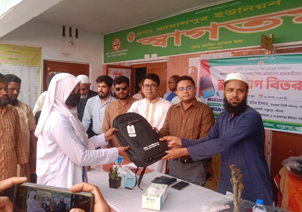 এডিপির অর্থায়নে উপজেলার জামালপুর ইউনিয়ন পরিষদের চেয়ারম্যান জাহিদ হাসান শুভ’র সভাপতিত্বে প্রধান অতিথি হিসেবে স্কুলব্যাগ বিতরণ অনুষ্ঠানে বক্তব্য রাখেন, উপজেলা প্রকৌশলী মো. মেনাজ,প্রধান শিক্ষক আনোয়ারুল ইসলাম, প্রধান শিক্ষক তাজুল ইসলাম, ইউপির সদস্য আমিনুল ইসলাম, সাইদুল ইসলাম, ইয়াছিন আলী, আবুল কালাম, ইউপির প্রশাসনিক কর্মকর্তা আফলাক হোসেন প্রমুখ।