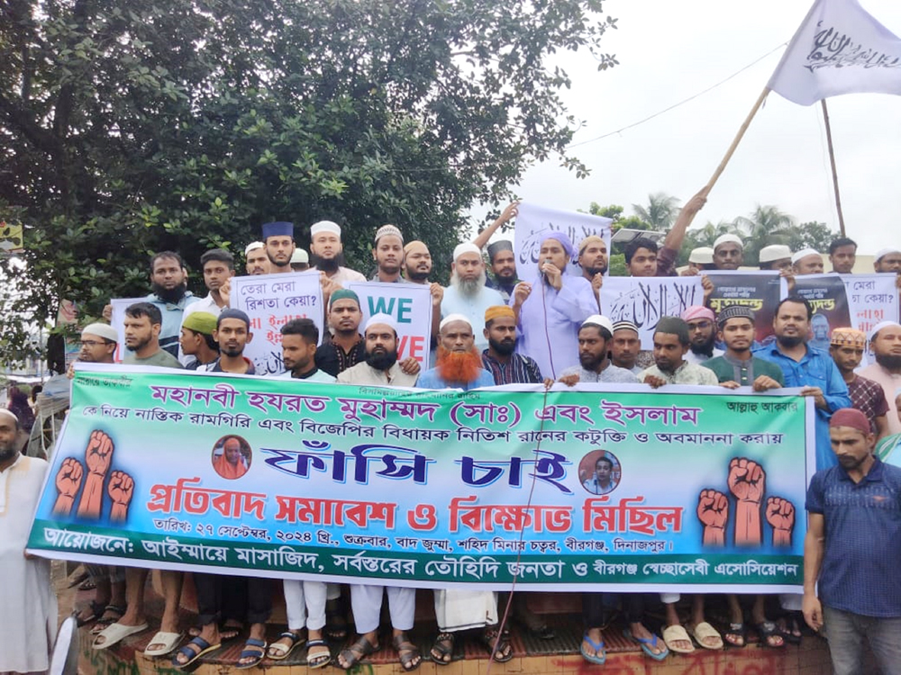 শুক্রবার (২৭সেপ্টেম্বর) দুপুরে উপজেলার আইম্মায়ে মাসাজিদ, সর্বস্তরের তৌহিদি জনতা ও বীরগঞ্জ স্বেচ্ছাসেবী এসোসিয়েশন এর আয়োজনে উপজেলার সর্বস্তরের মুসল্লিরা উপস্থিত থেকে উপজেলার কেন্দ্রীয় মসজদি হতে বিক্ষোভ মিছিলটি বের হয়ে পৌরশহরের প্রধান প্রধান সড়ক প্রদক্ষিণ করে বিজয় চত্ত্বরে এসে বিক্ষোভ সমাবেশ অনুষ্ঠিত হয়।