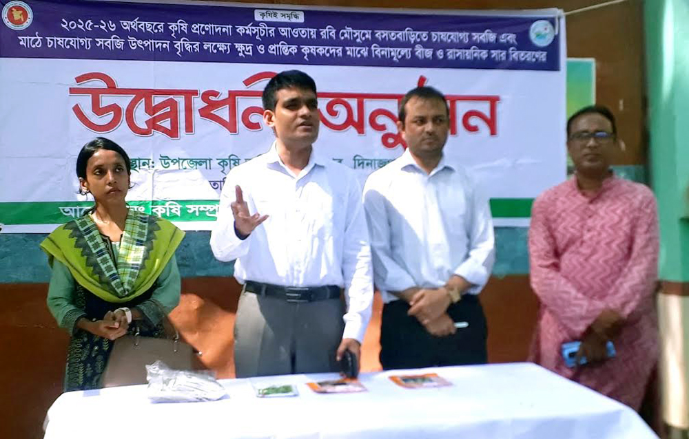 ২০২৫-২৬ অর্থ বছরের কৃষি প্রণোদনা কর্মসূচির আওতায় বসতভিটা ও মাঠে সবজি উৎপাদন বৃদ্ধির লক্ষ্য দিনাজপুরের হাকিমপুর হিলিতে বিনামূল্যে ক্ষুদ্র ও প্রান্তিক কৃষকদের মাঝে বিভিন্ন সবজির বীজ ও রাসায়নিক সার বিতরণ করা হয়েছে।
