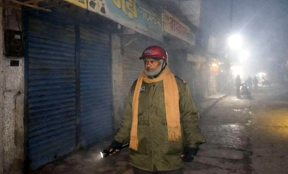 শরীরে বয়সের ভার, তবুও দায়িত্বের ভার তাকে থামিয়ে দিতে পারেনি। মোটা জামা আর পুরোনো চাঁদর নিজেকে জড়িয়ে নিয়েও শীতে কাঁপছে তার শরীর। কাঁপতে কাঁপতে তিনি দোকানের শাটারের সামনে দাঁড়ান, গলিপথ ধরে হেঁটে যান, কোথাও সন্দেহজনক কিছু আছে কি না তা খেয়াল রাখেন। প্রতিটি ব্যবসা প্রতিষ্ঠানের সামনে কিছুক্ষণ থেমে নিশ্চিত হন-সব ঠিক আছে কিনা। ঘুম যাতে না ধরে বাঁশিতে হুইসেল বাজিয়ে নিজেকে সজাগ রাখেন।