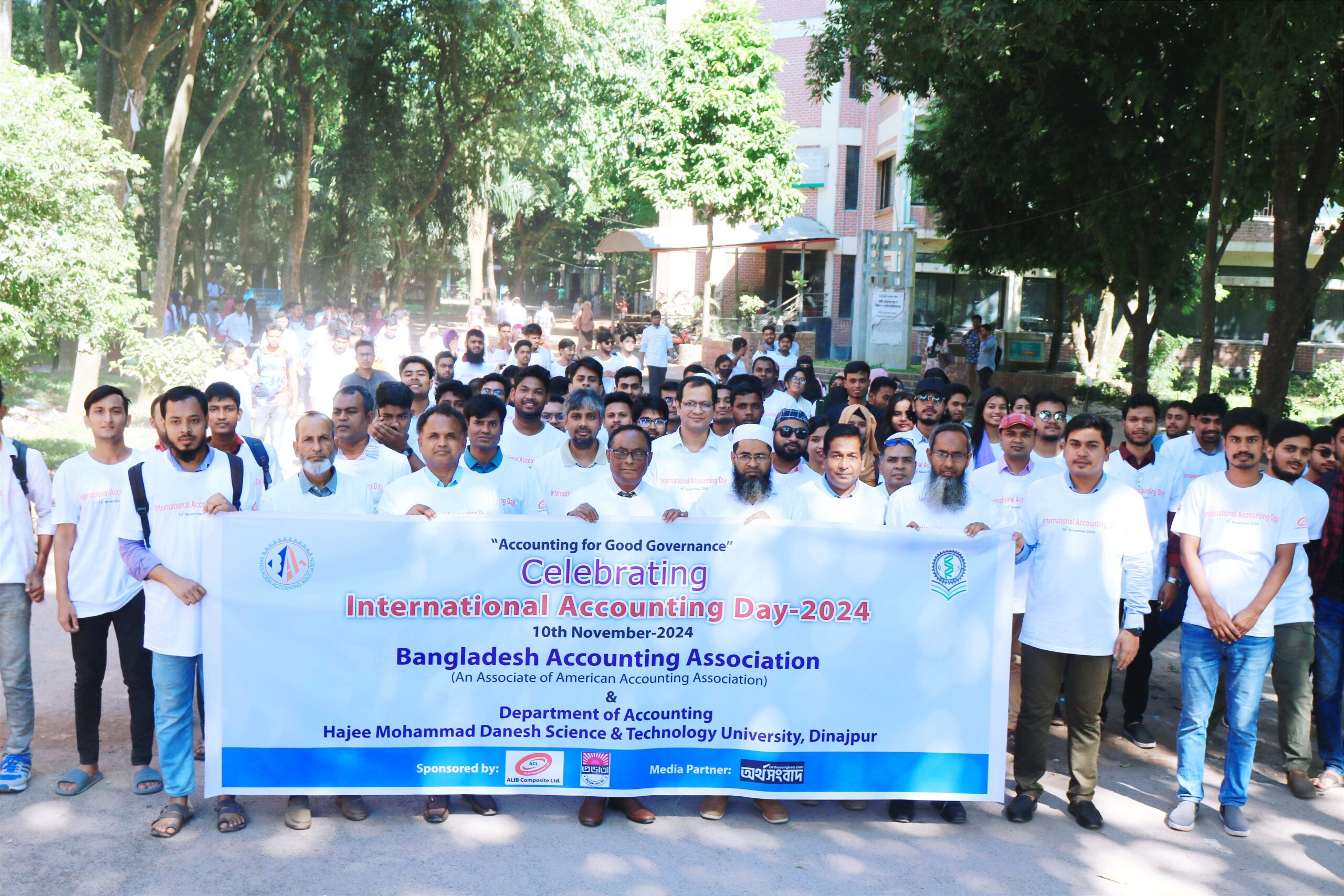 হাজী মোহাম্মদ দানেশ বিজ্ঞান ও প্রযুক্তি বিশ্ববিদ্যালয়ে (হাবিপ্রবি) বাংলাদেশ একাউন্টিং এসোসিয়েশন ও একাউন্টিং বিভাগের আয়োজনে ইন্টারন্যাশনাল একাউন্টিং ডে-২০২৪ উদযাপন করা হয়েছে। এ উপলক্ষ্যে আজ (রোববার) সকাল ১০ টায় ভাইস-চ্যান্সেলর প্রফেসর ড. মো. এনামউল্যা’র নেতৃত্বে এক বর্ণাঢ্য র্যালি ক্যাম্পাস প্রদক্ষিণ করে। এতে বিশ্ববিদ্যালয়ের প্রো ভাইস-চ্যান্সেলর প্রফেসর ড. মো. শফিকুল ইসলাম সিকদার, বিজনেস স্টাডিজ অনুষদের ডীন প্রফেসর মো. মামুনার রশিদ, রেজিস্টার প্রফেসর ড. এম. জাহাঙ্গীর কবির, বিভিন্ন বিভাগীয় চেয়ারম্যান, প্রক্টর, বিভিন্ন শাখা ও বিভাগের পরিচালকবৃন্দসহ অন্যান্য শিক্ষক-কর্মকর্তা ও শিক্ষার্থীবৃন্দ অংশগ্রহণ করেন। র্যালি শেষে একাউন্টিং বিভাগে কেক কাটার আয়োজন করা হয়। এ সময় ভাইস-চ্যান্সেলর বলেন, সাধারণভাবে দেখতে গেলে একাউন্টিং বিষয়টিকে জনপ্রিয় করার লক্ষে প্রতি বছর বিশ্বজুড়ে দিনটি উদযাপন করা হয়। তিনি বলেন, আমরা সবাই কম বেশি একাউন্টিং এর সাথে জড়িত এবং উচ্চ শিক্ষাক্ষেত্রে প্রতিটি বিষয়ের ক্ষেত্রেই একাউন্টিং রিলেটেড কিছু গবেষণা থাকেই। শিক্ষার্থীদের উদ্দেশ্যে তিনি বলেন, আশা করি তোমাদের হাত ধরে হাবিপ্রবির একাউন্টিং বিভাগ আরও সমৃদ্ধ হবে। এছাড়াও দিবসটি উপলক্ষ্যে বিভাগের পক্ষ থেকে শিক্ষার্থীদের জন্য কুইজ প্রতিযোগিতার আয়োজন করা হয়।